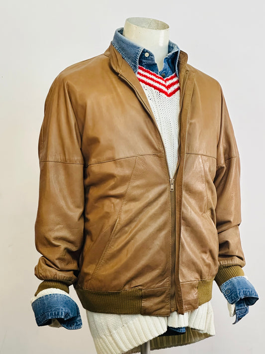 🧥 Giacca vintage in pelle color miele chiaro – Bomber anni ’80