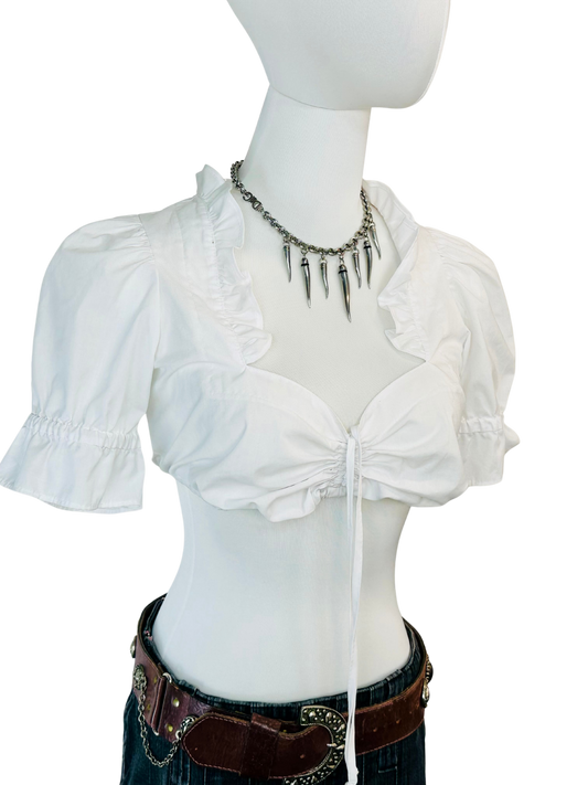 Crop Top Bianco con Maniche a Sbuffo e Coulisse