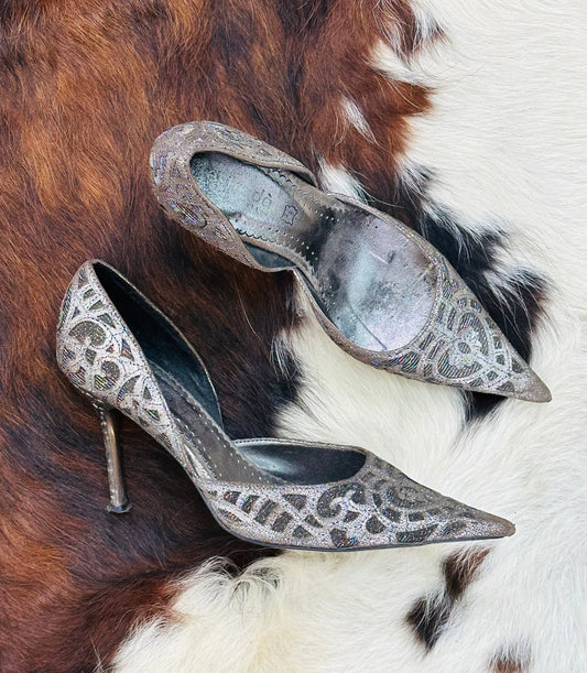 Décolleté vintage in pizzo lamé bronzo con tacco scolpito – Made in Italy