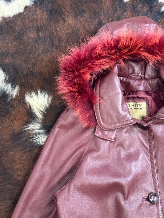 Giacca di pelle Rosso Borgogna con cappuccio e pelliccia