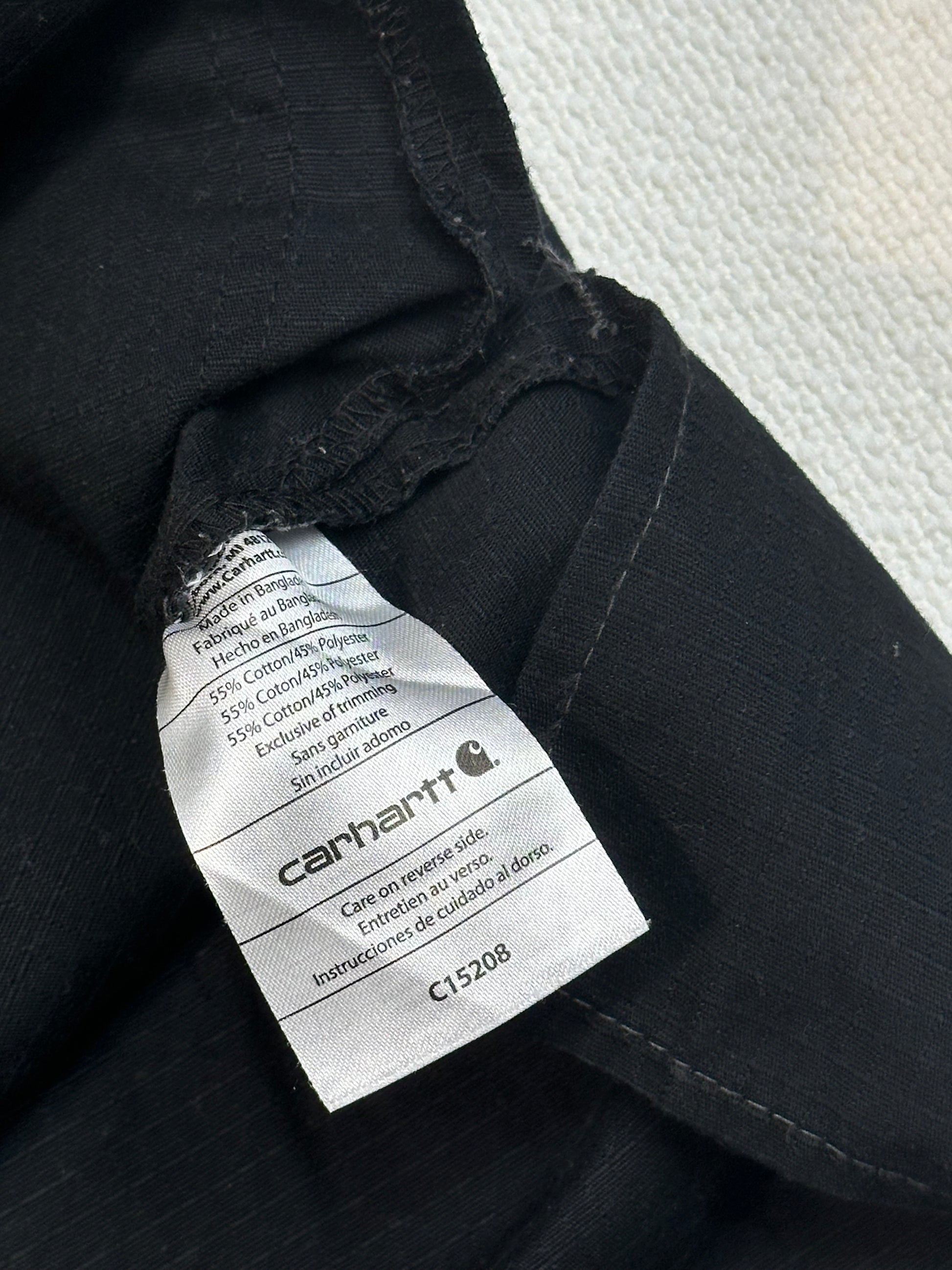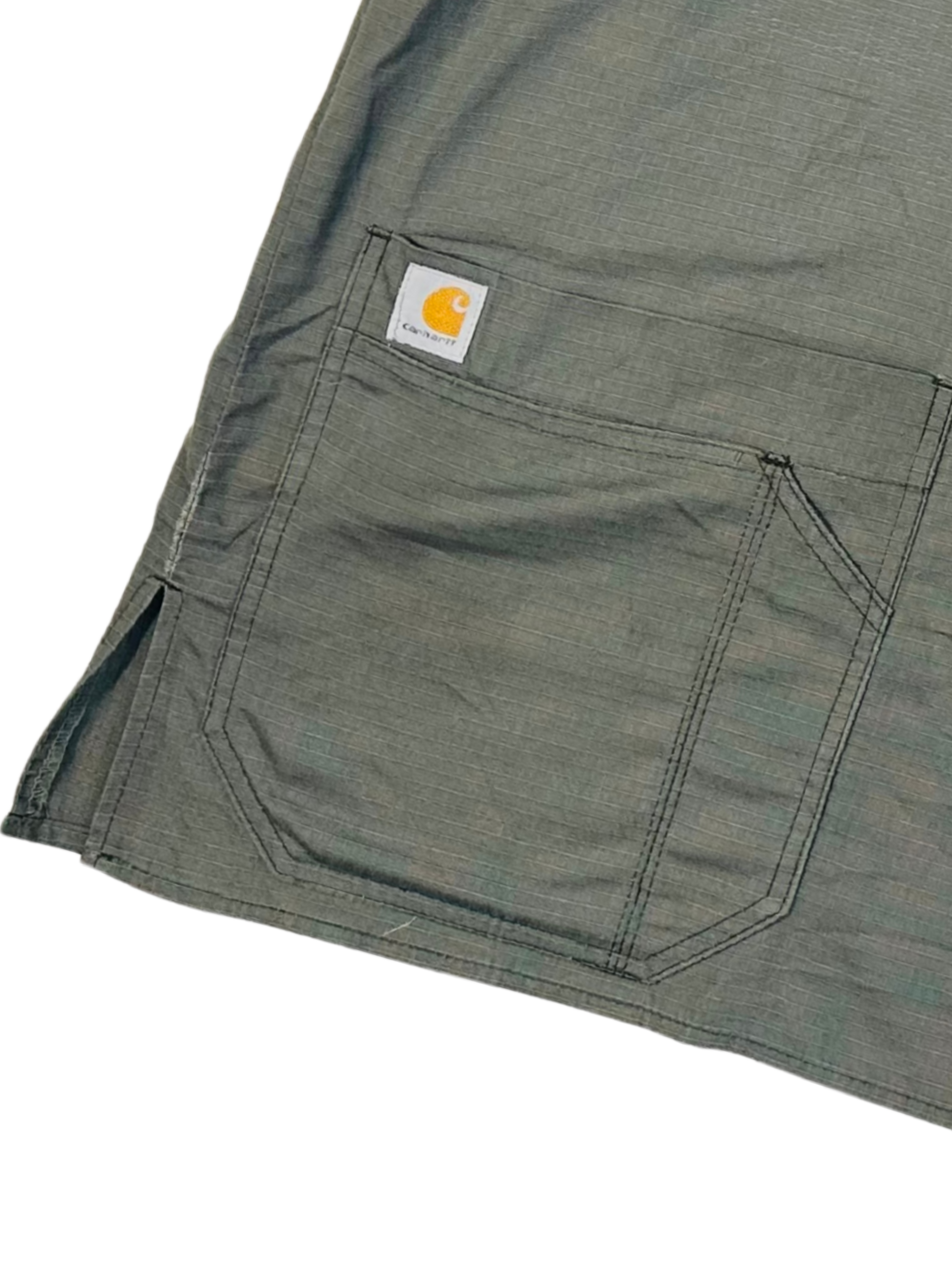 Realizzata in robusto cotone ripstop con cuciture rinforzate e tre tasche frontali funzionali — una sul petto e due maxi tasche inferiori, di cui una con label Carhartt cucita ✂️