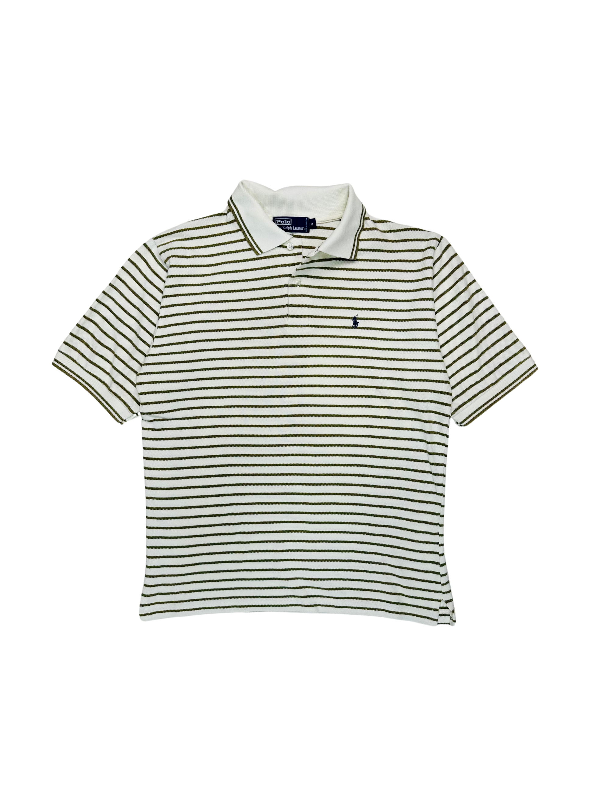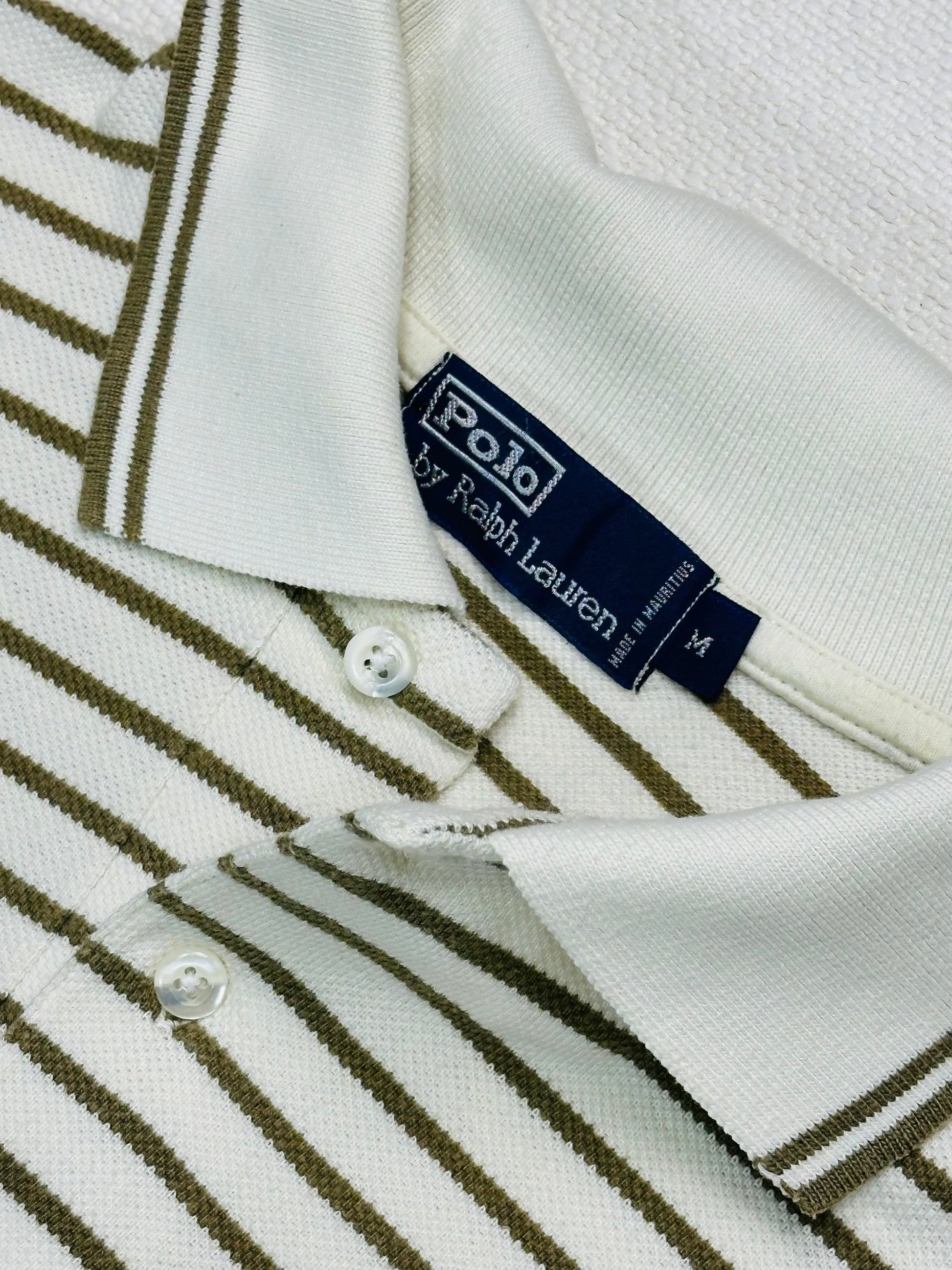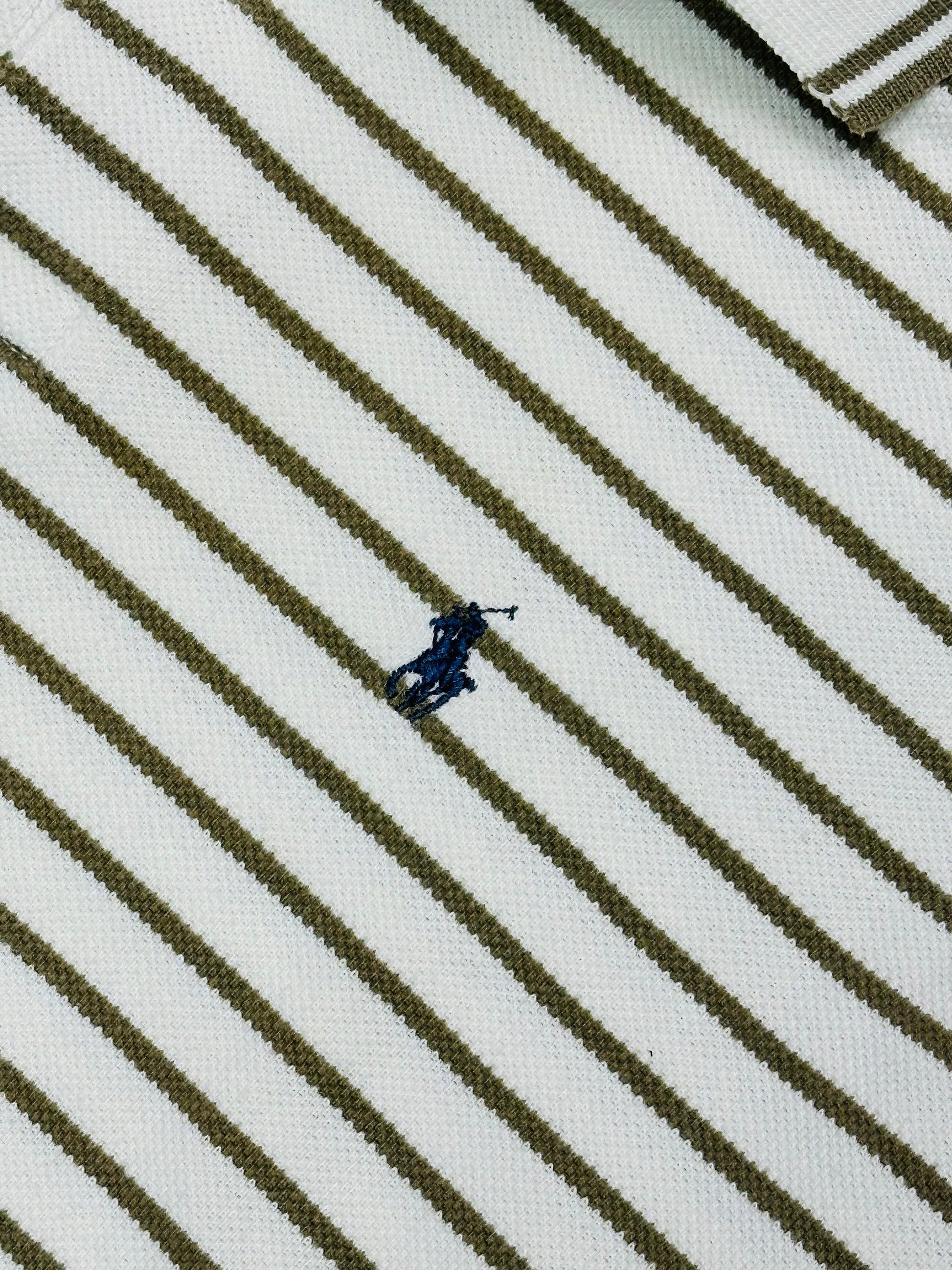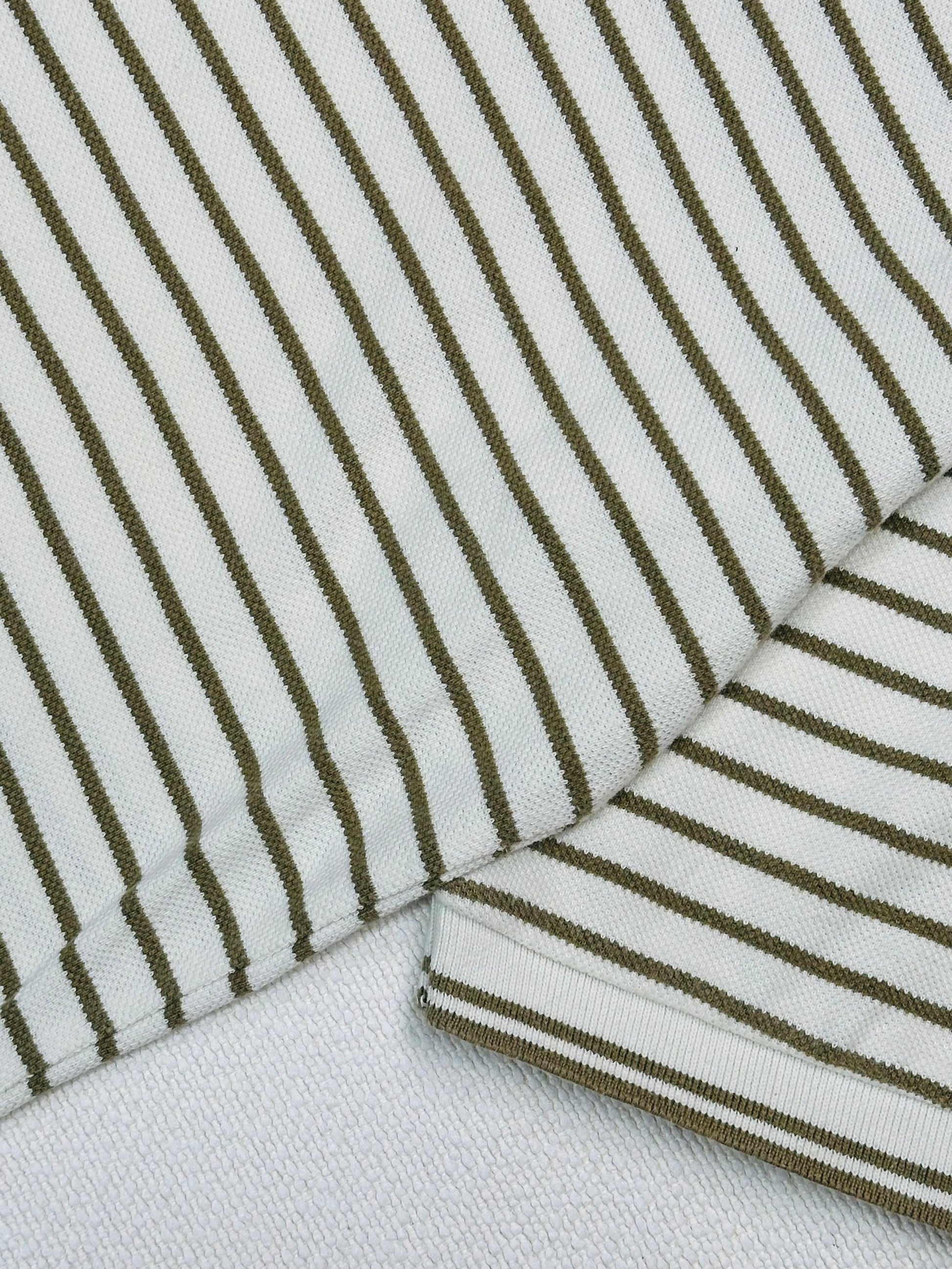 Un classico intramontabile del guardaroba maschile, questa polo firmata Polo by Ralph Lauren combina eleganza sportiva e fascino retrò. Caratterizzata da un motivo a righe sottili verde oliva su base bianca, è l’emblema della raffinatezza americana con un twist preppy vintage.