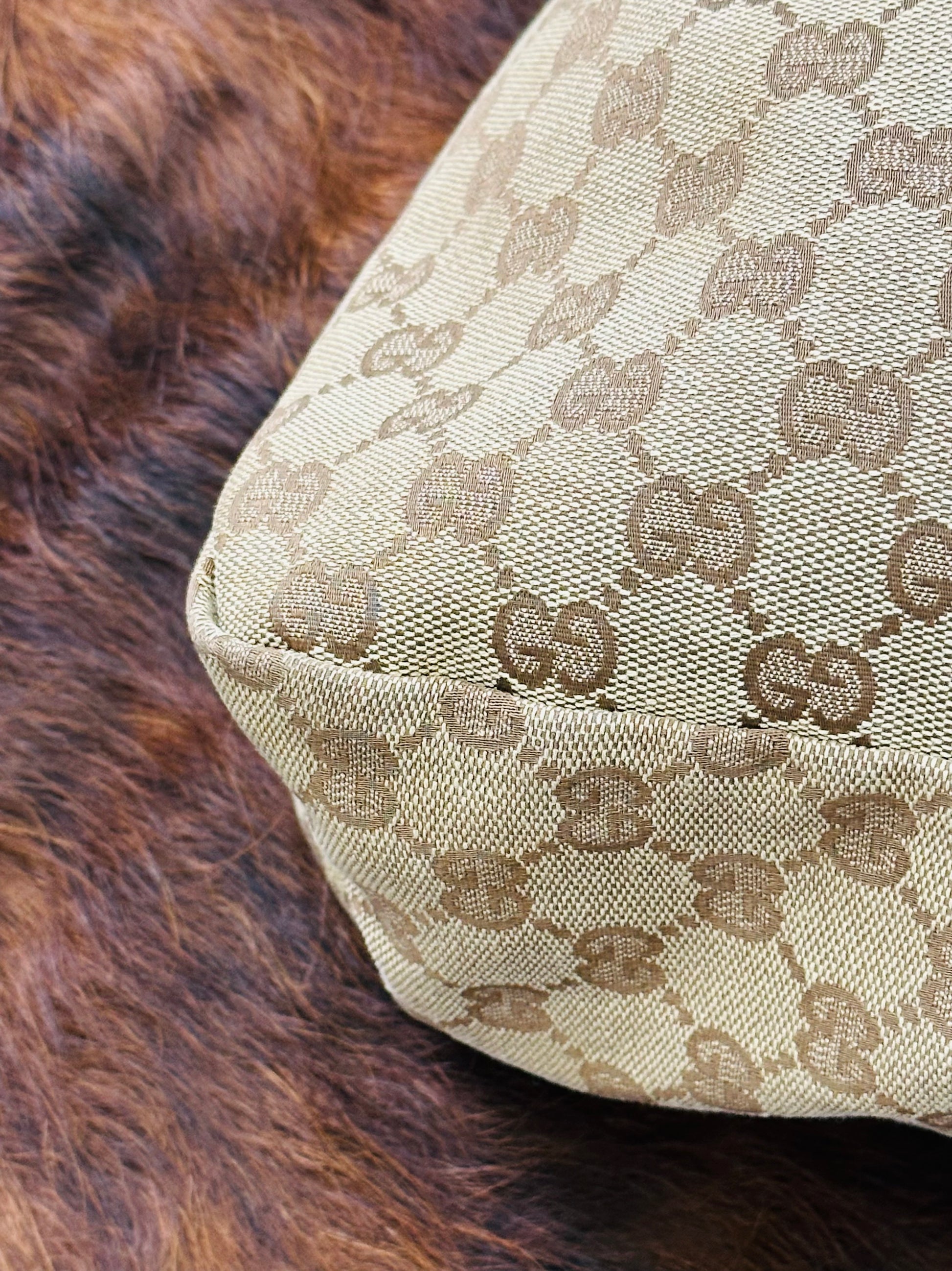 Il monogramma GG nasce negli anni '60 in onore del fondatore Guccio Gucci, ma è tra gli anni '90 e 2000 che viene proposto in nuove silhouette più morbide e funzionali per la vita urbana. Questa borsa in particolare appartiene alla generazione pre-digital della moda, quando i loghi tornavano ad essere protagonisti, ma con uno spirito più boho e casual, perfetto per l'epoca Y2K.