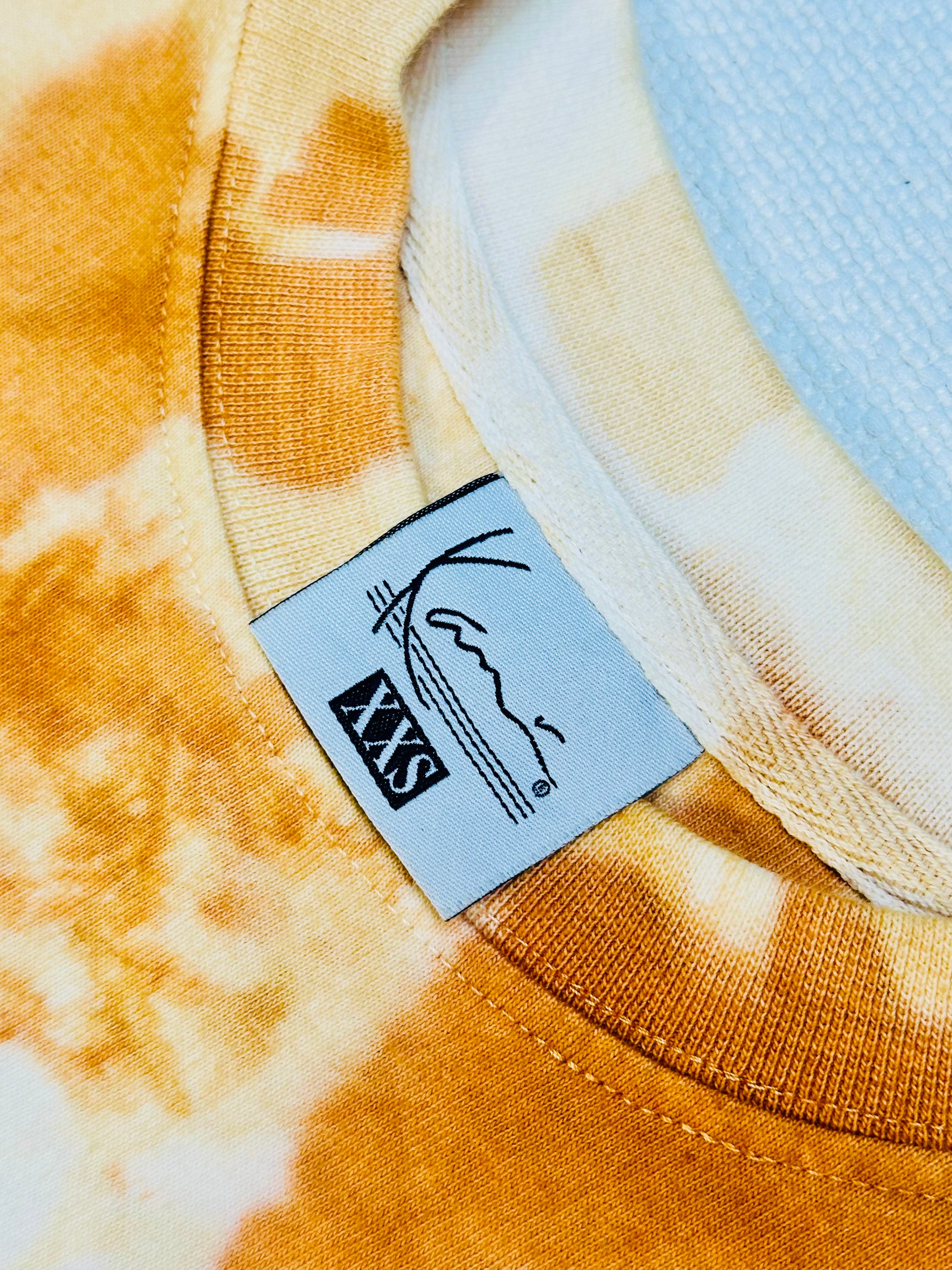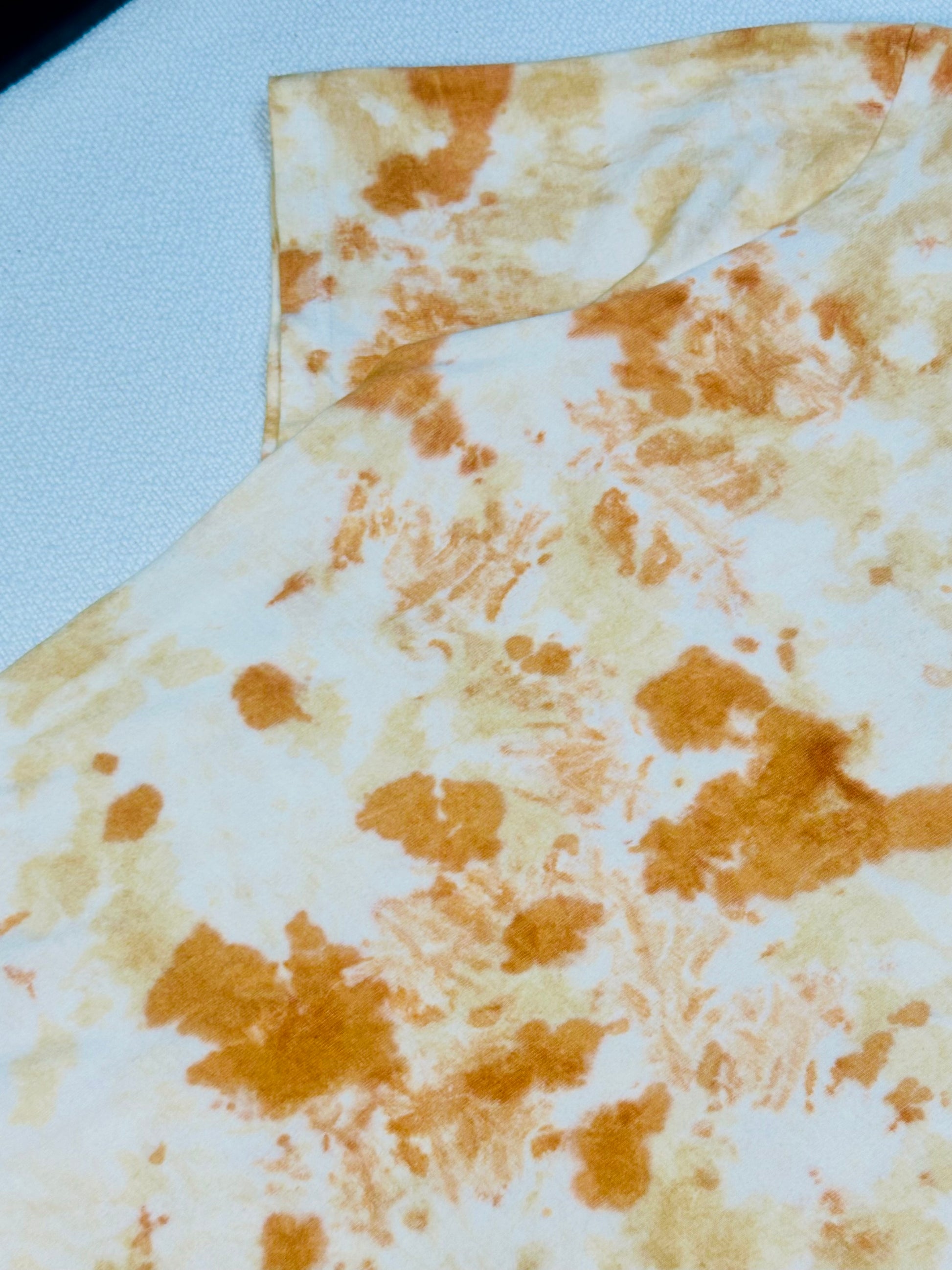 - Colore: Bianco con motivo tie-dye ocra/arancio