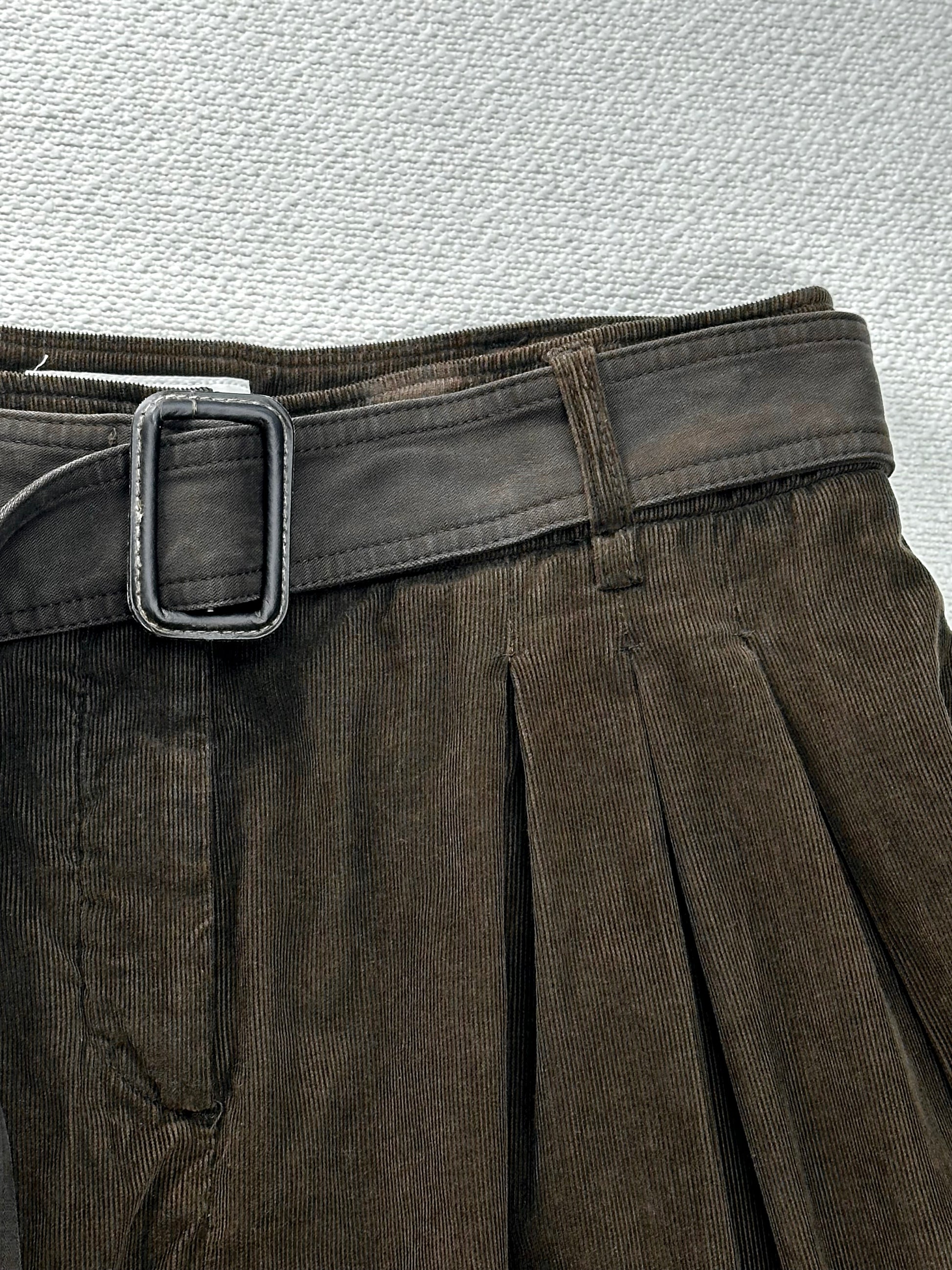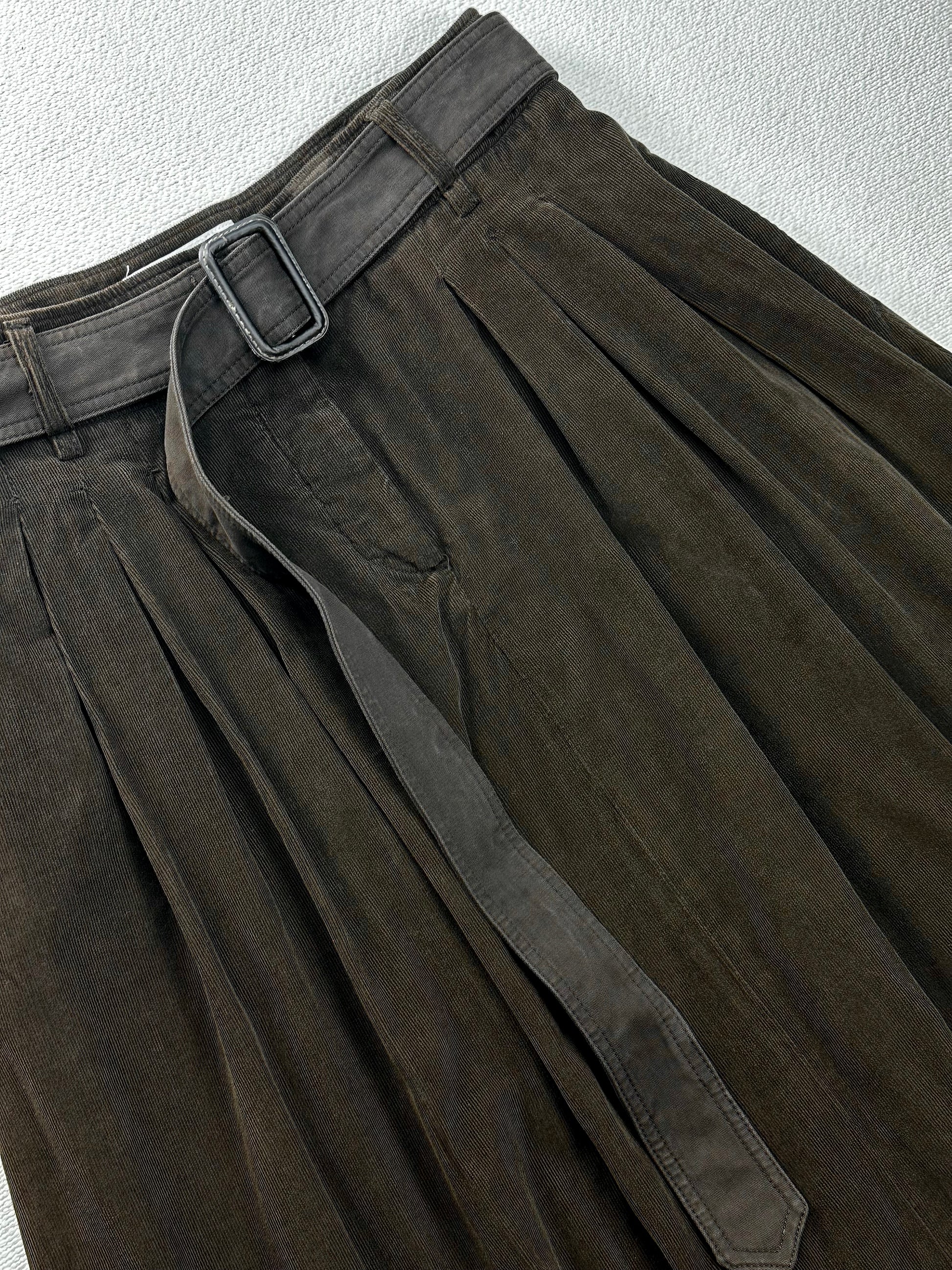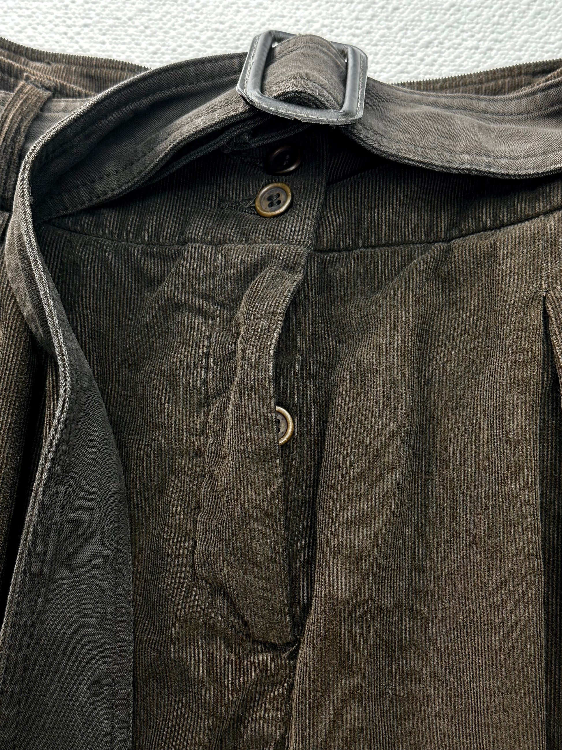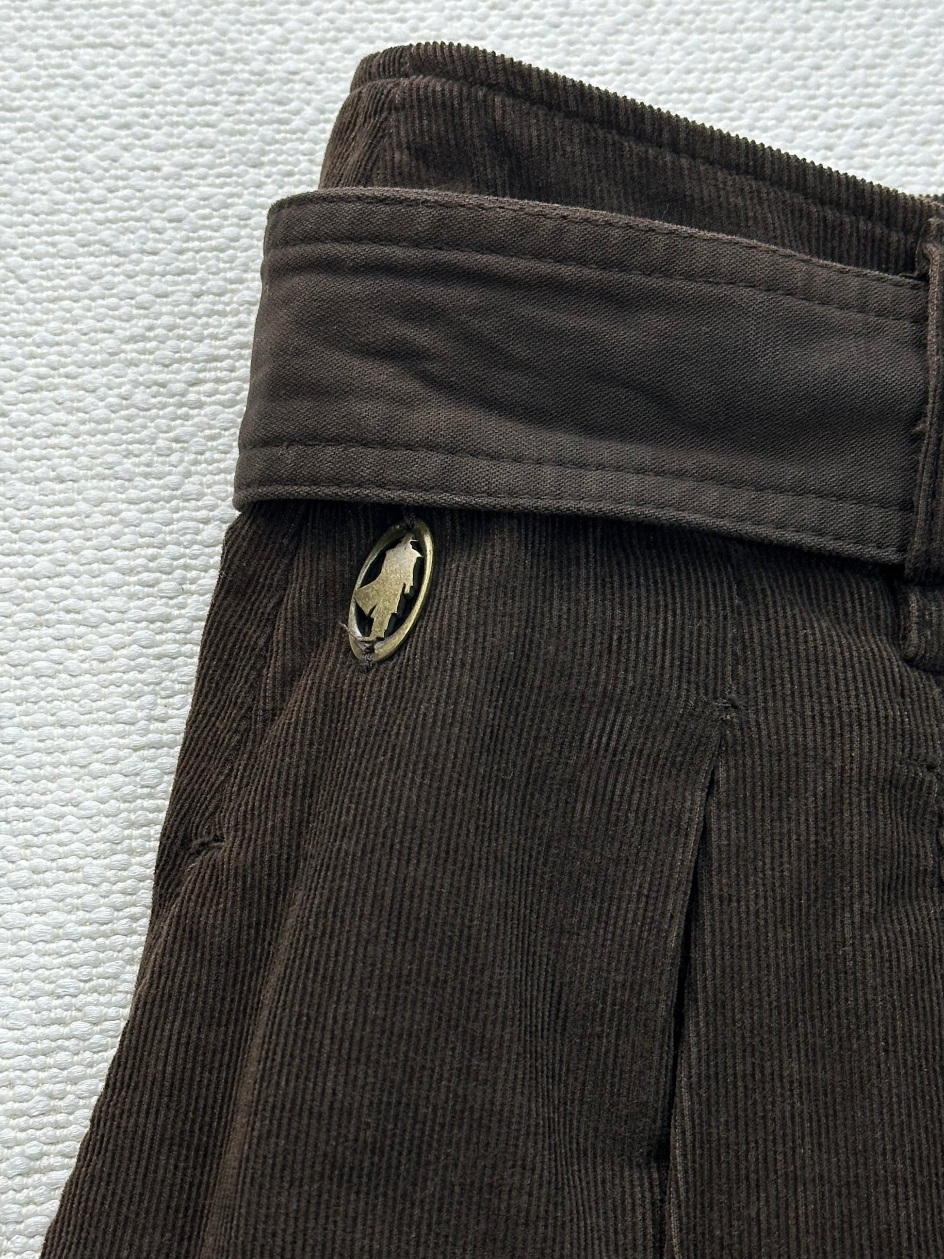 Gonna midi firmata MCS Marlboro Classics, realizzata in velluto a coste di cotone marrone con taglio ampio a pieghe e cintura coordinata in tessuto con fibbia rettangolare in pelle. Un modello d’ispirazione workwear anni ’90/2000, dallo stile pratico ma raffinato, che unisce comfort e carattere.