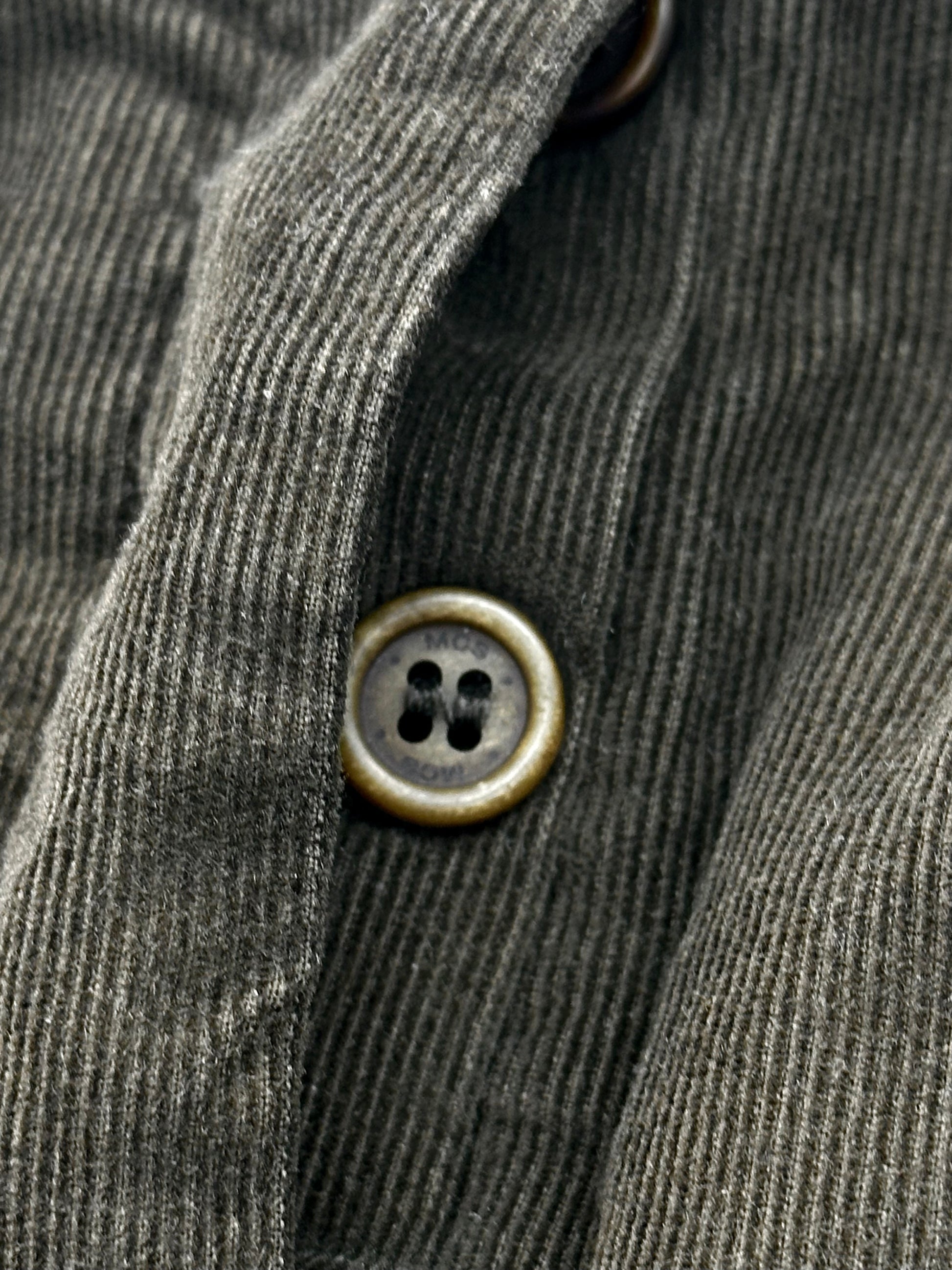 Il design presenta chiusura frontale con bottoni interni, passanti in vita, plissettature morbide e dettaglio distintivo del logo metallico MCS applicato sul fianco.