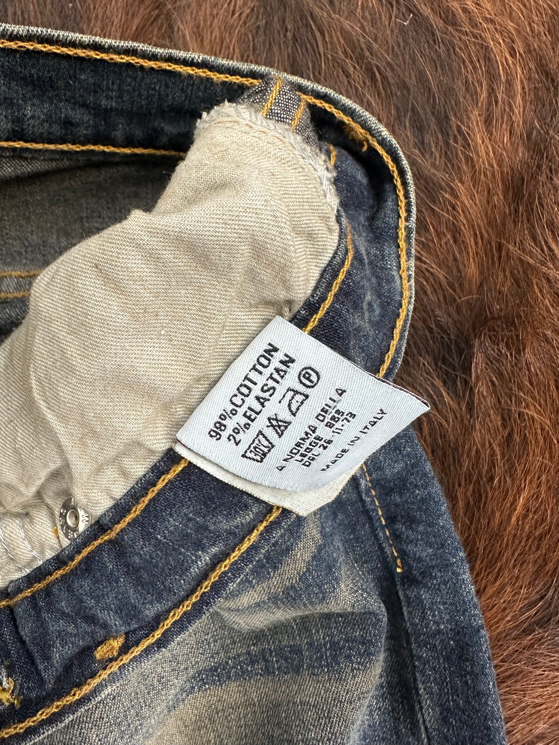 Questi NEW JEANS presentano un lavaggio blu medio con scoloriture verticali e whiskering marcato sul davanti, elementi chiave dei flare vintage originali. La gamba segue una linea aderente fino al ginocchio per poi aprirsi in una svasatura netta e decisa: perfetti con stivali, zeppe e sneakers chunky.