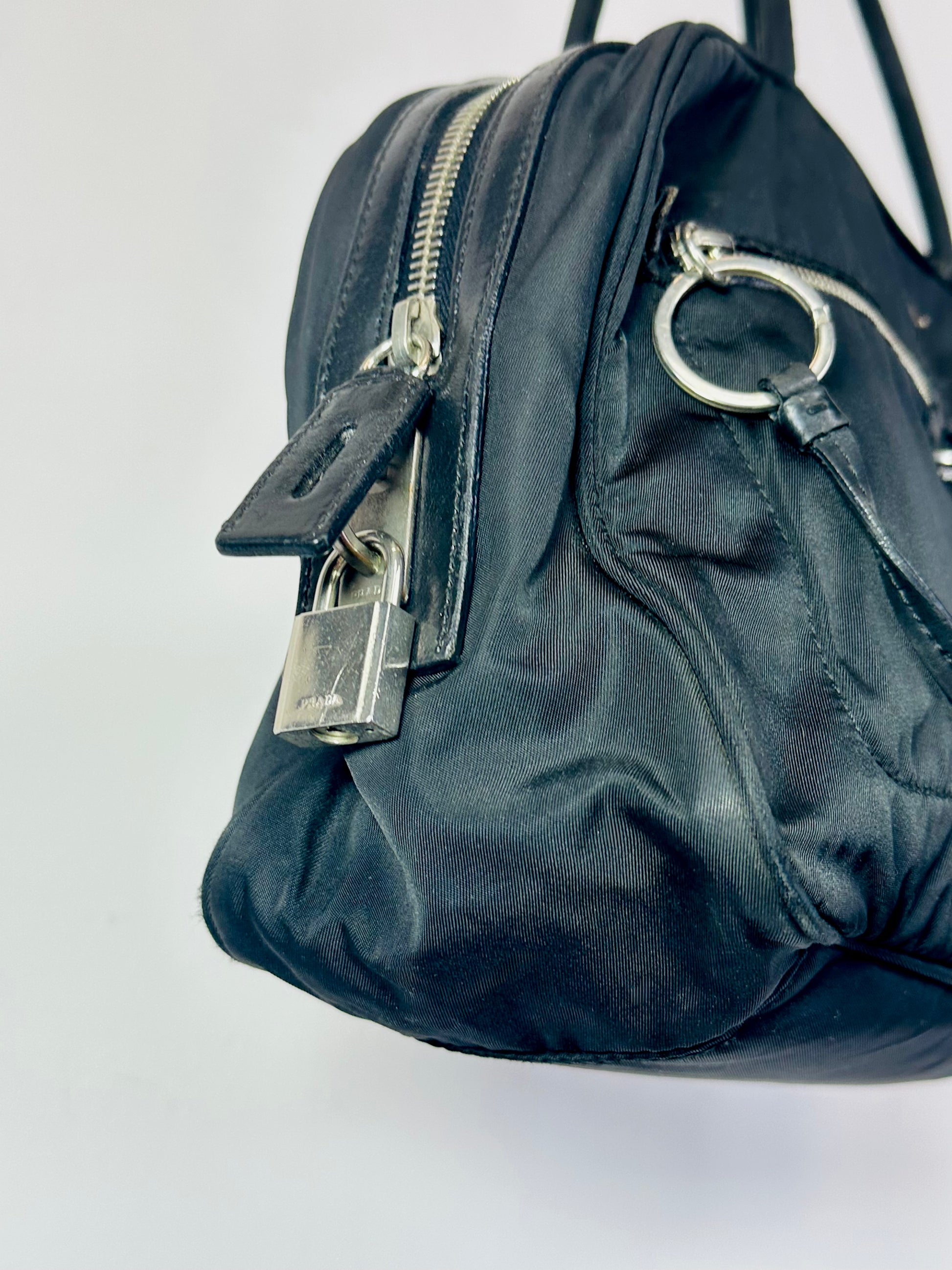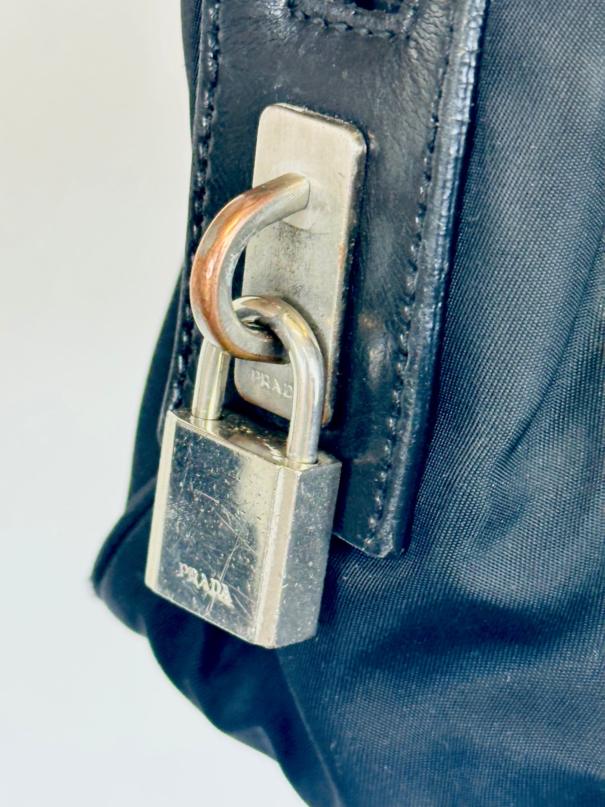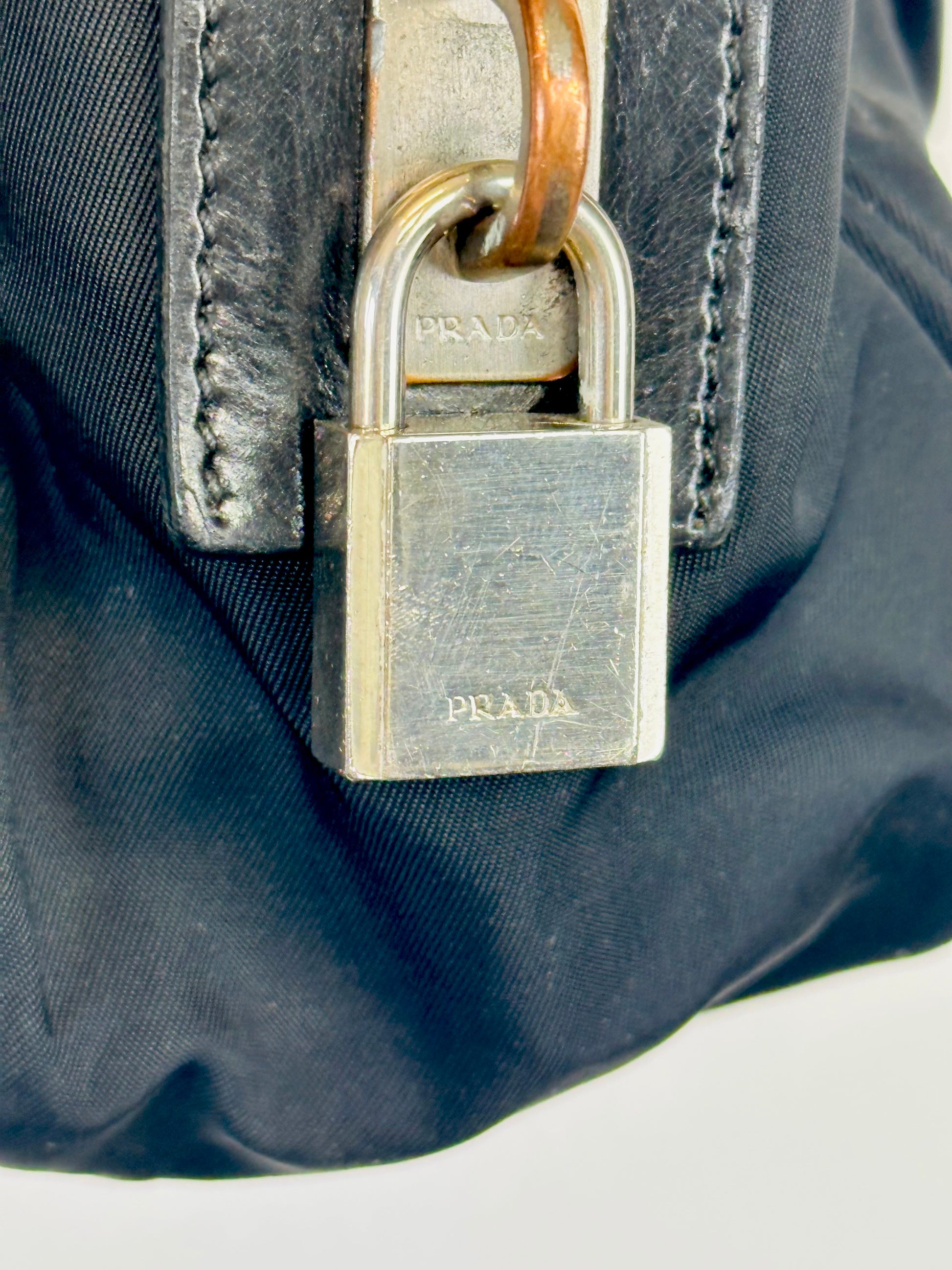 - Lucchetto originale Prada laterale con chiavi custodite in charm in pelle.