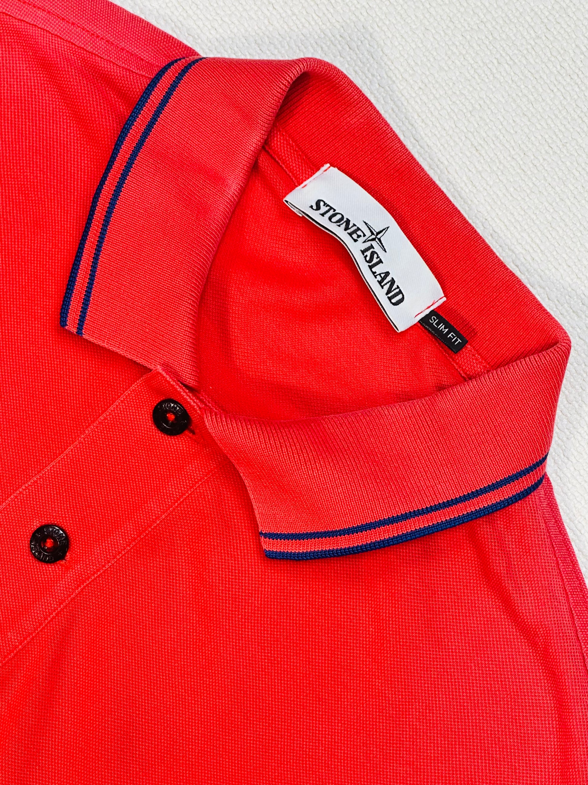 Una reinterpretazione essenziale dell’estetica Stone Island, sinonimo di ricerca, identità e fedeltà al culto casual. Questa polo è caratterizzata da un taglio slim e da un tono rosso acceso a contrasto con il patch classico del brand, cucito sul petto. Il dettaglio a coste con doppia riga blu navy sul colletto e sulle maniche aggiunge un tocco distintivo al capo.